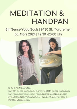 Komm nach St. Margrethen im wunderschönen St. Galler Rheintal. 6th Sense Yoga Souls und Raum der Impulse haben sich etwas ganz Besonderes ausgedacht und bieten euch eine 30-MINÜTIGE MEDITATION begleitet mit sanften HANDPAN-KLÄNGEN von Sandra Kilchenmann an. Meditation hilft deinen Geist wieder frei zu machen und dich zu zentrieren. Dieses Special findet nach einer gewohnten Yoga Praxis gemäss dem Stundenplan von 6th Sense Yoga statt.
