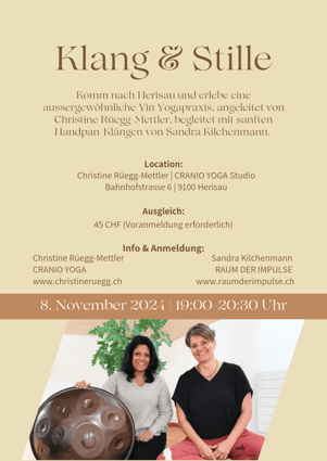Leitung: Christine Rüegg-Mettler (Yogainstruktion), Sandra Kilchenmann (Handpan)