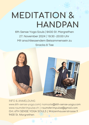 Komm nach St. Margrethen ins wunderschöne St. Galler Rheintal. 6th Sense Yoga Souls und Raum der Impulse haben sich etwas ganz Besonderes ausgedacht und bieten euch eine 30-MINÜTIGE MEDITATION begleitet mit sanften HANDPAN-KLÄNGEN von Sandra Kilchenmann an. Meditation hilft deinen Geist wieder frei zu machen und dich zu zentrieren. Dieses Special findet nach einer gewohnten Yoga Praxis gemäss dem Stundenplan von 6th Sense Yoga statt.