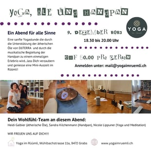 Als Trio aus dem wunderschönen St. Galler Rheintal vereinigen wir Yoga, ätherische Öle und die Klänge der Handpan zu einem einmaligen Event "YOGA, ÖLE & HANDPAN".