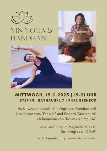 Im November begleite ich mit der Handpan eine weitere Yin-Yogastunde in meiner Heimat. Der Event findet im Bewegungsstudio in Berneck statt.